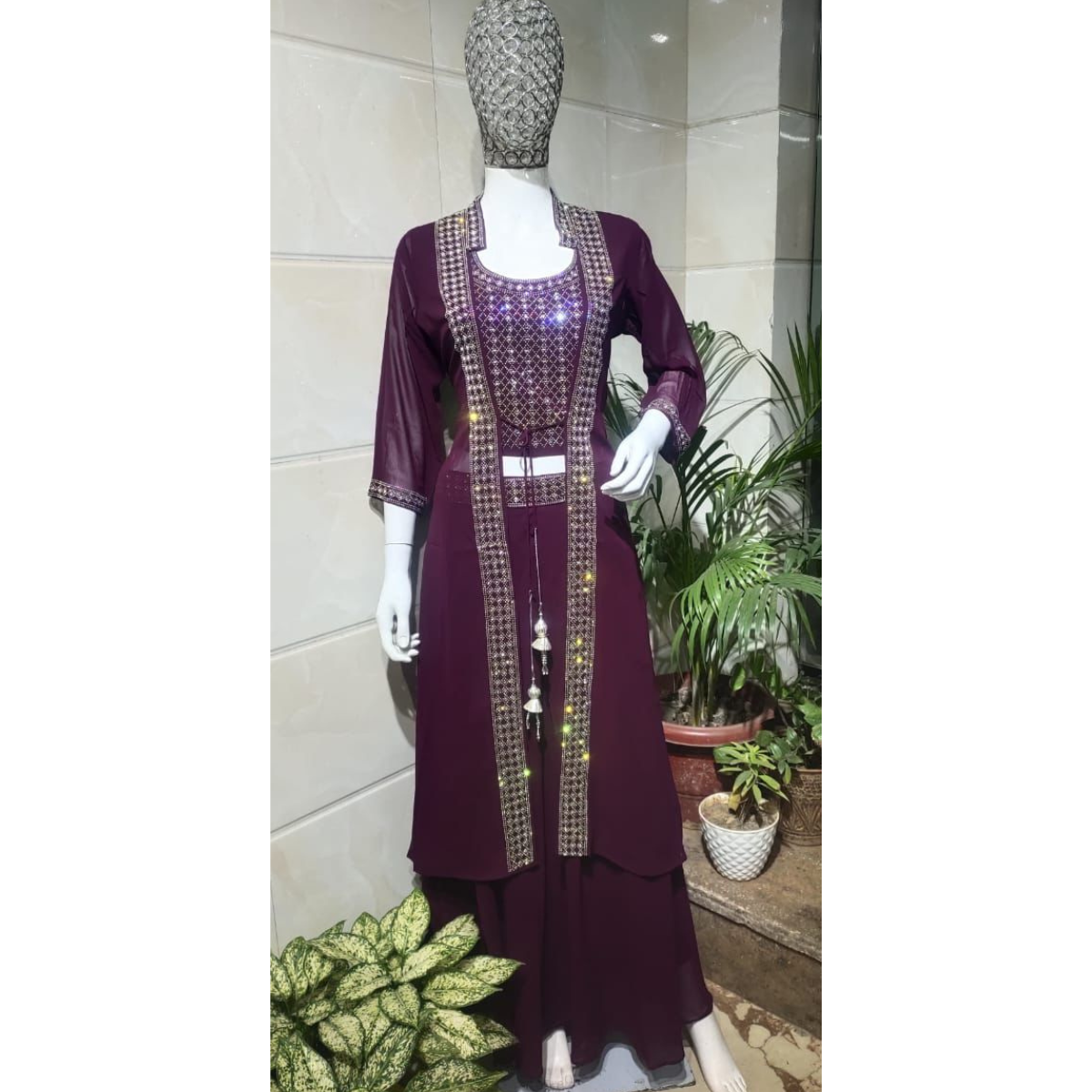 A designer jacket-style sharara set in georgette, beautifully enhanced with intricate mirror and thread embroidery. Perfect for festive, wedding, and party occasions.