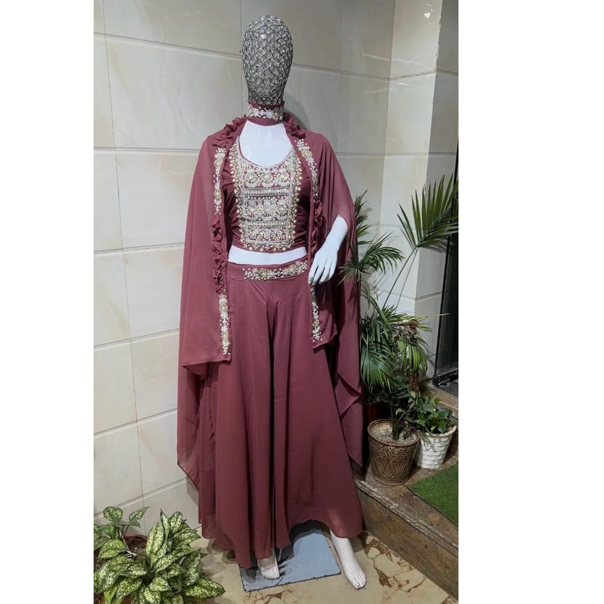 Add effortless grace to your festive wardrobe with this embroidered dusty mauve palazzo jacket set. The floral embroidered crop top paired with flowy palazzo pants and a coordinated jacket makes it a versatile pick for weddings, receptions, sangeet nights, or parties. The soft muted color and fine embroidery give it a sophisticated, modern appeal.