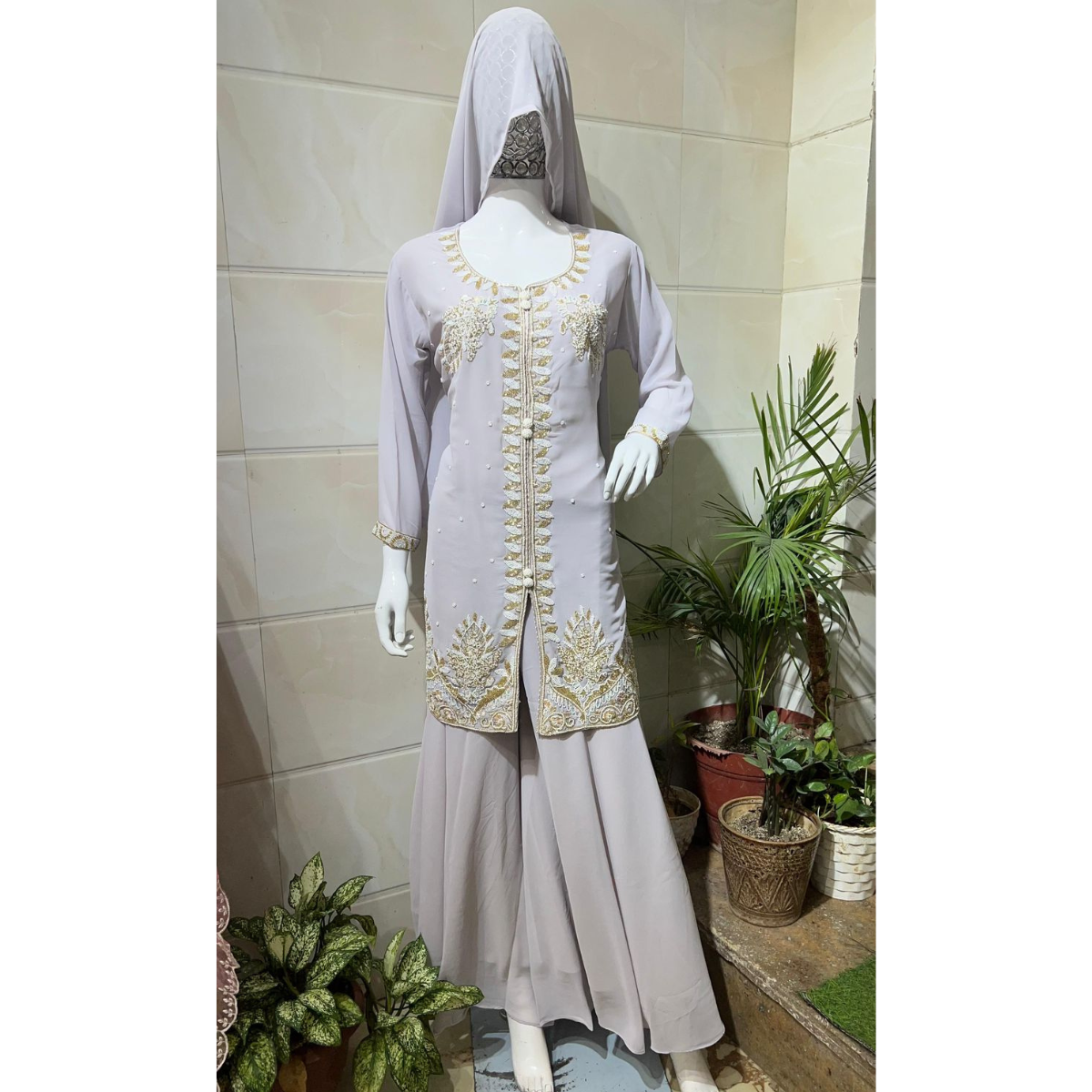 Make an elegant statement with this luxury embroidered sharara suit, designed in flowy georgette fabric for comfort and grace. The straight kurti is adorned with intricate zari embroidery and delicate pearl embellishments along the neckline, front, and hemline, creating a royal look. Paired with a wide-flared sharara bottom and a matching dupatta, this ensemble strikes the perfect balance between tradition and modernity.