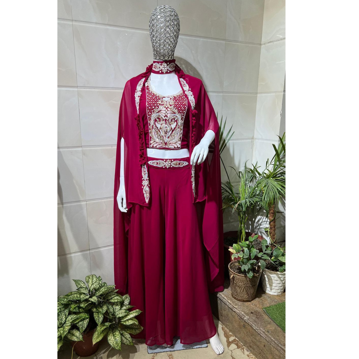 •Set Includes: Embroidered Crop Top, Palazzo, Jacket, Belt