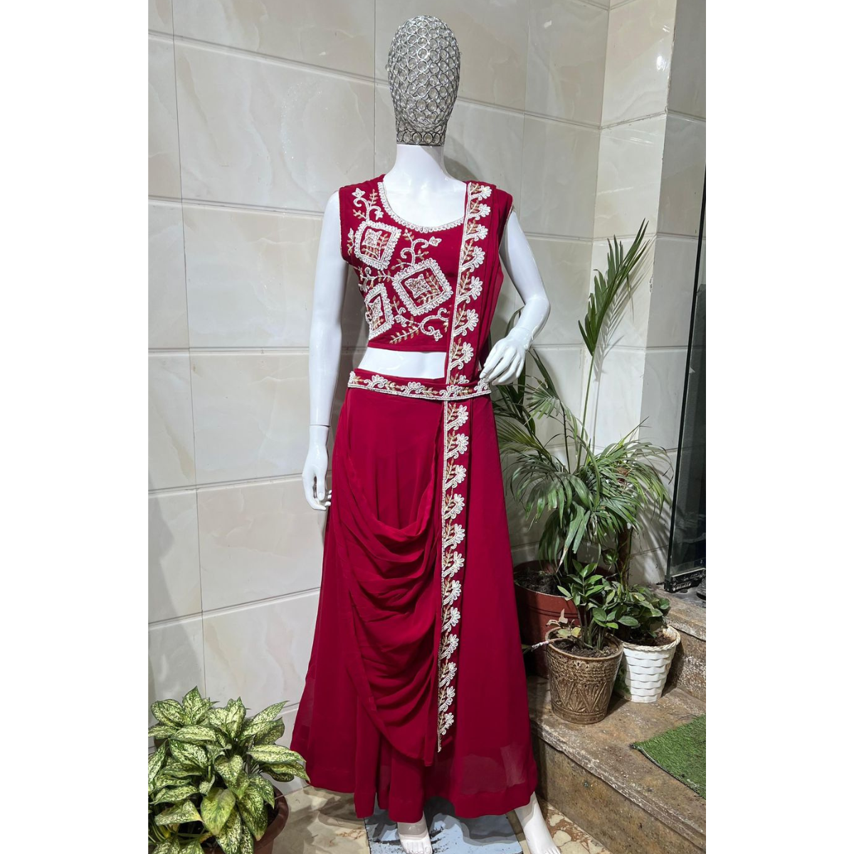 The attached draped skirt adds a modern twist, creating a flowy yet structured look ideal for parties, weddings, and festive occasions. Detailed embroidery along the drape and waistline enhances the overall sophistication, while the lightweight fabric ensures comfort and effortless style.